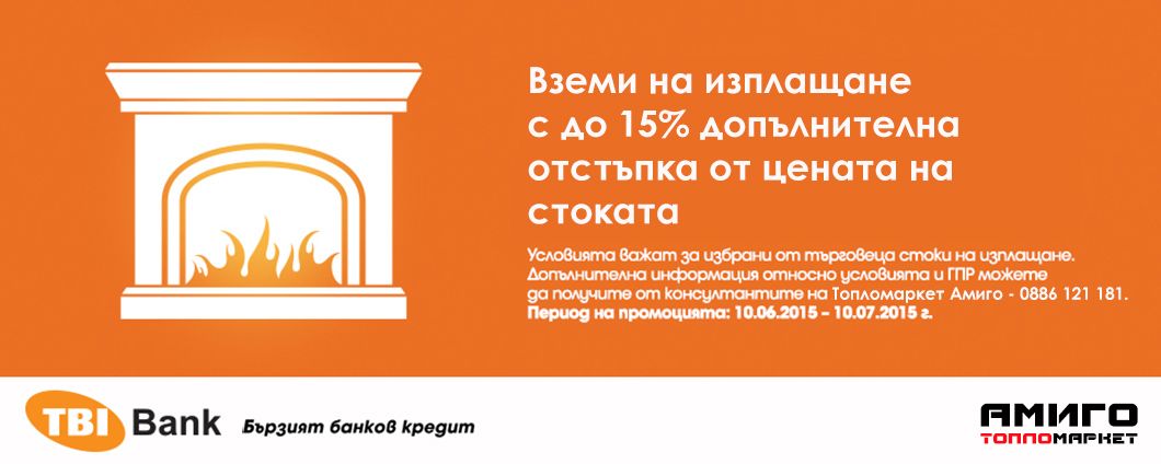 При закупуване на стока на изплащане с TBI Bank, можете да получите 15% допълнителна отстъпка от цената на стоката в магазините на Топломаркет Амиго, както и при поръчка онлайн.