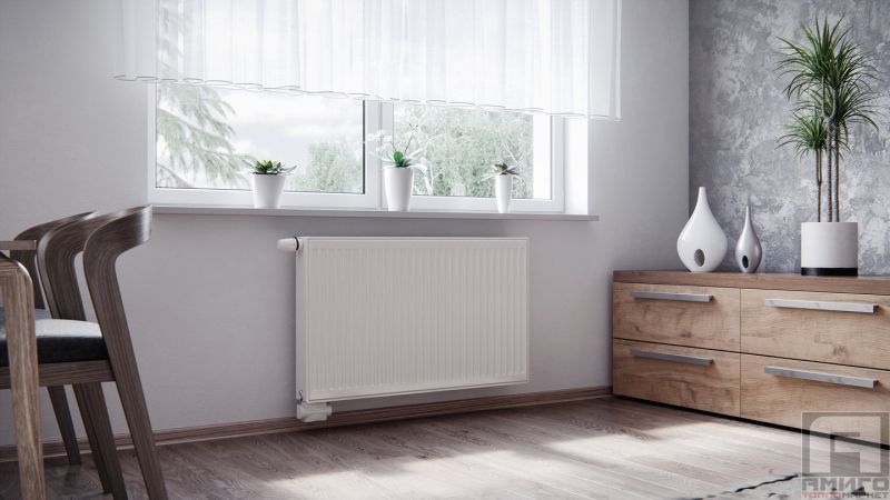 Панелно отоплително тяло в изпълнение VENTIL KOMPAKT, което позволява дясно или ляво долно свързване към отоплителна система с принудителна циркулация.
