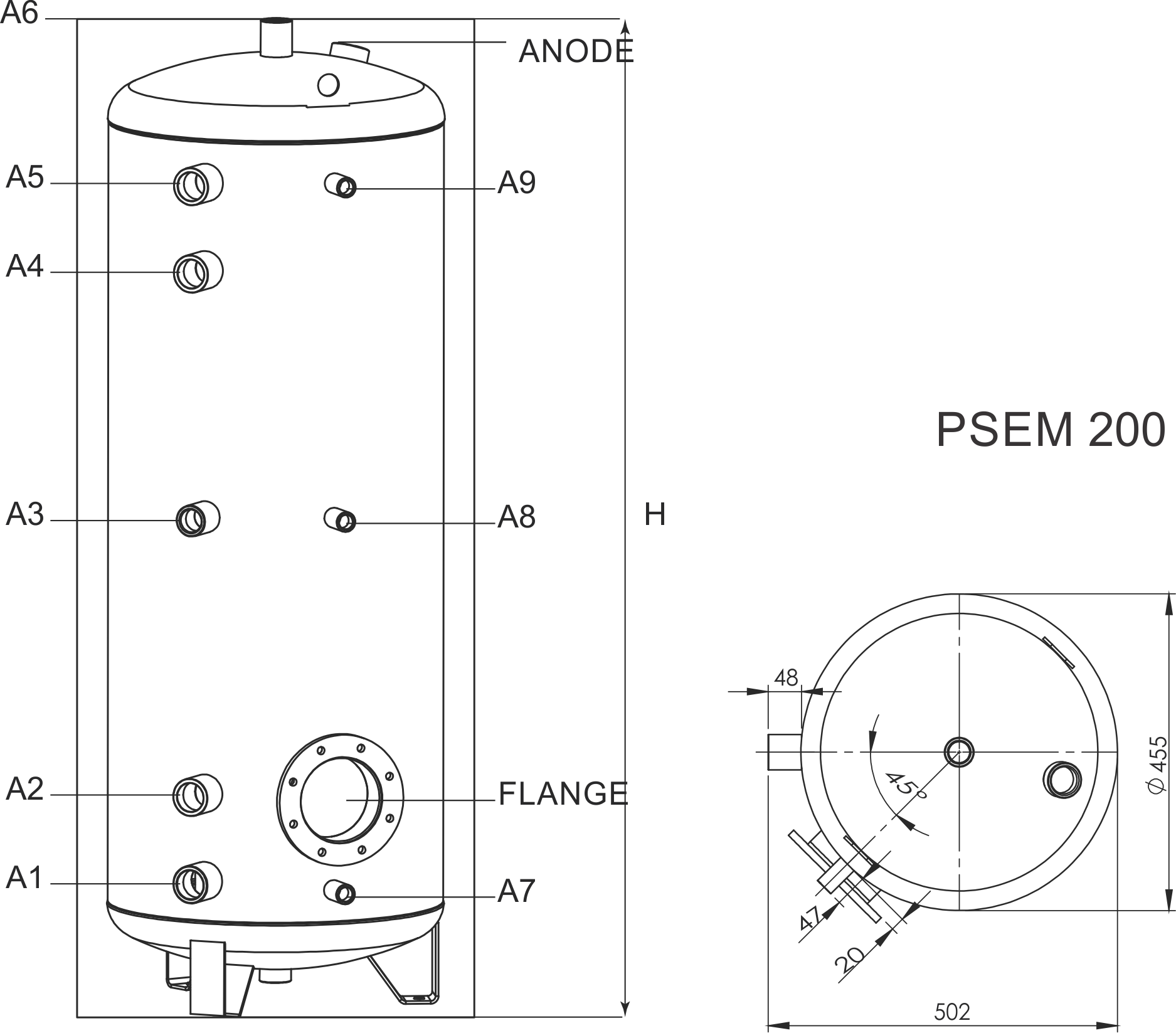 PSЕM 200 Вместимост L 200 Височина H, mm 1340 Монтажна височина mm 1460 Диаметър без изолация / с изолация и обшивка D, mm Ø 455/560 Работно налягане/макимална температура на буфера bar/0C 10/95 Мощност на котела за присъединяване към буфера kW 6-10 Тегло буферен съд kg 64 A1, mm Rp11/4”/195 A2, mm Rp11/4”/314 A3, mm Rp1”/690 A4, mm Rp11/4”/1026 A5, mm Rp11/4”/1145 A6, mm Rp1”/1340 A7, mm Rp1/2”/183 A8, mm Rp1/2”/690 A9, mm Rp1/2”/1145 Ревизионен отвор / Фланец Fl, mm, Ø, mm 180/309