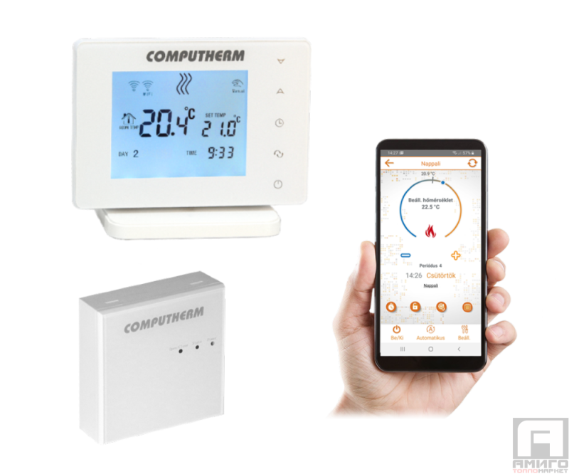 Wi-Fi термостат COMPUTHERM E400RF се състои от два блока. Единият е термостатът (предавателят), другият е приемникът, който управлява котела. Между двата блока има безжична (радиочестотна) връзка, така че не е необходимо изграждане на жична линия, което е особено полезно при модернизиране на стари сгради.